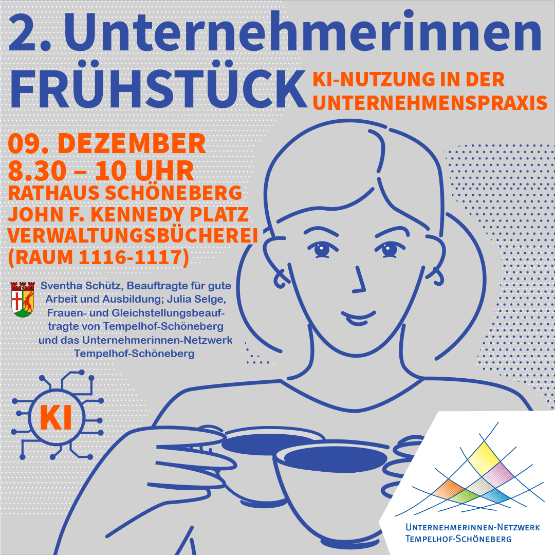 Wir laden Dich herzlich zum zweiten Unternehmerinnenfrühstück ein. Zum Thema „KI-Nutzung in der Unternehmenspraxis“ gibt es zwei Inputs von der Digitalagentur Berlin und vimaki. Beim Frühstücksbuffet hast Du die Möglichkeit, Dich mit anderen selbstständigen Frauen auszutauschen und zu vernetzen.