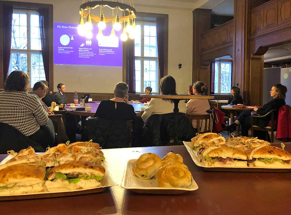 Zwei sehr informative Inputs zu „KI in der Unternehmenspraxis“ von Lotte Prädikow, Referentin „Digitale Transformation“ bei der Digitalagentur Berlin, und Virginia Moukouli, Co-Gründerin und KI-Managerin von vimaki, veranlassten die Teilnehmerinnen zum regen Austausch über eigene Erfahrungen.